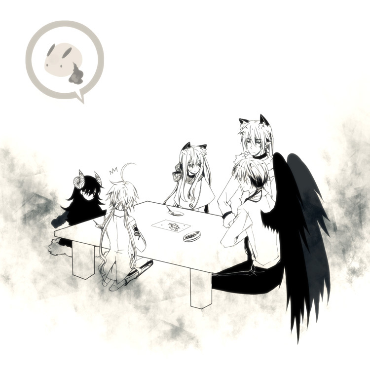 端拿著餐具過來的硝子注意到雷的表情有點奇怪,咏也是有話想說的樣子,小小的狼耳晃動著。