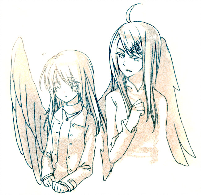 我遠遠地觀察聚在一起的孩子們,坐在雅莎季身邊的薇格側身探出頭來,直盯著咏的毛毛狼耳瞧,咏也細細凝視著薇格背後輕輕拍打的黑色翅膀,兩個白髮小女孩就這麼互看著對方的特徵,直到藍髮少女開口提醒才打斷這種稍為有趣的情形。